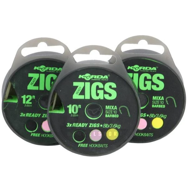 Korda Ready Zigs zijn kant-en-klare zig rigs die alleen nog aan de hoofdlijn hoeven te worden bevestigd! Korda Ready Zigs zijn uitgerust met een vlijmscherpe Korda Mixa haak, worden inclusief drie kleuren zigs geleverd en zijn perfect op de diepte van het te bevissen water af te stemmen!